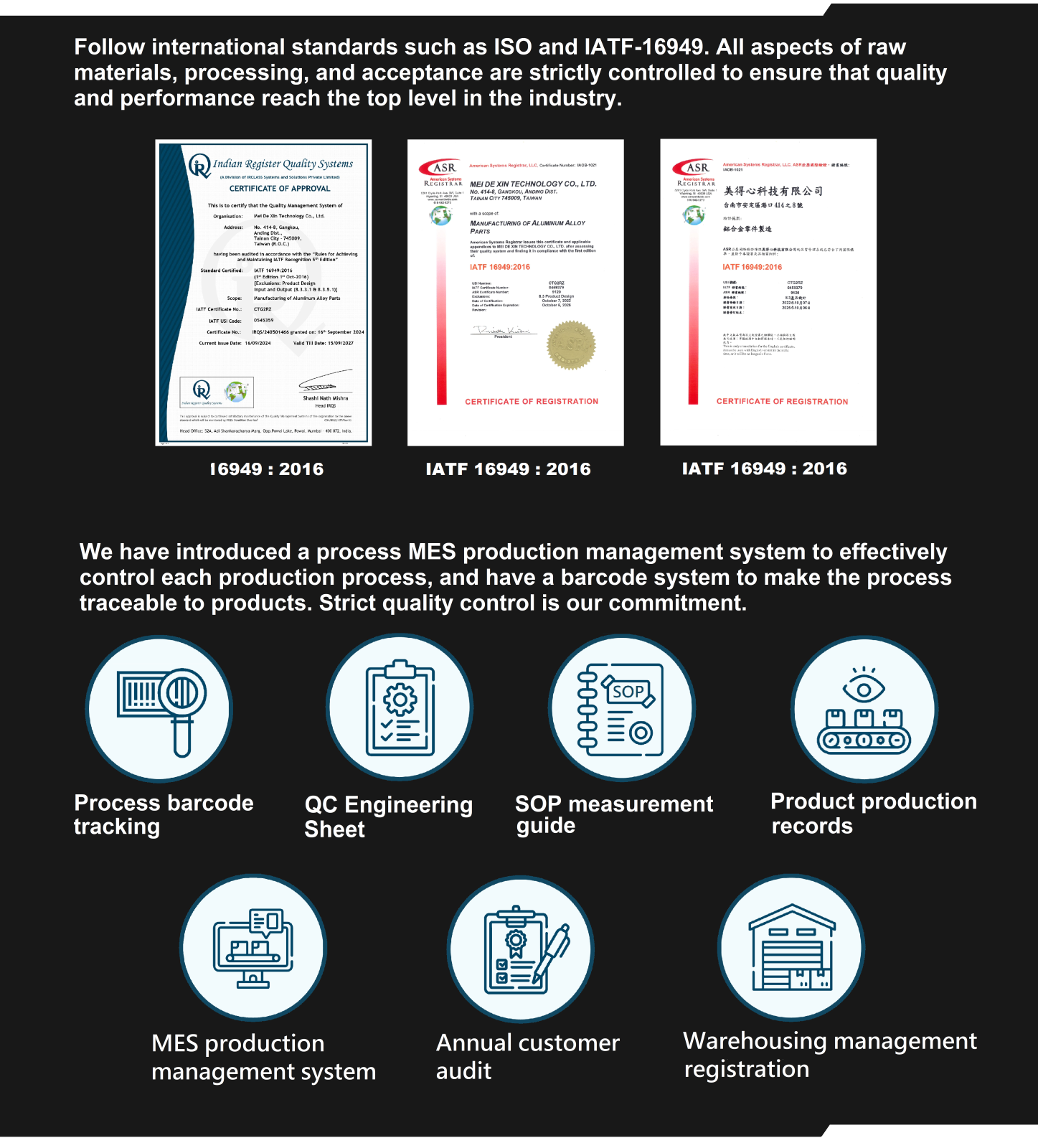 ●In order to improve product quality management, the company will introduce IATF16949 certification in 2022. Under the concept of quality first, we adhere to the quality policy of full participation and continuous improvement to provide customer-satisfied products and services, and actively participate in the annual tracking review and three-year formal review. |